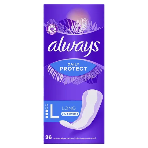 Restez protégée tout au long de la journée grâce aux protège-slips Always Daily Protect Long. Ces protège-slips sont plus longs et plus larges pour une meilleure protection et sont sans parfum. Avec leurs zones de protection latérales et leur zone absorbante, ils vous offrent une protection quotidienne en cas de pertes blanches, de règles irrégulières ou légères. Profitez de la sensation de fraîcheur d’une lingerie propre !